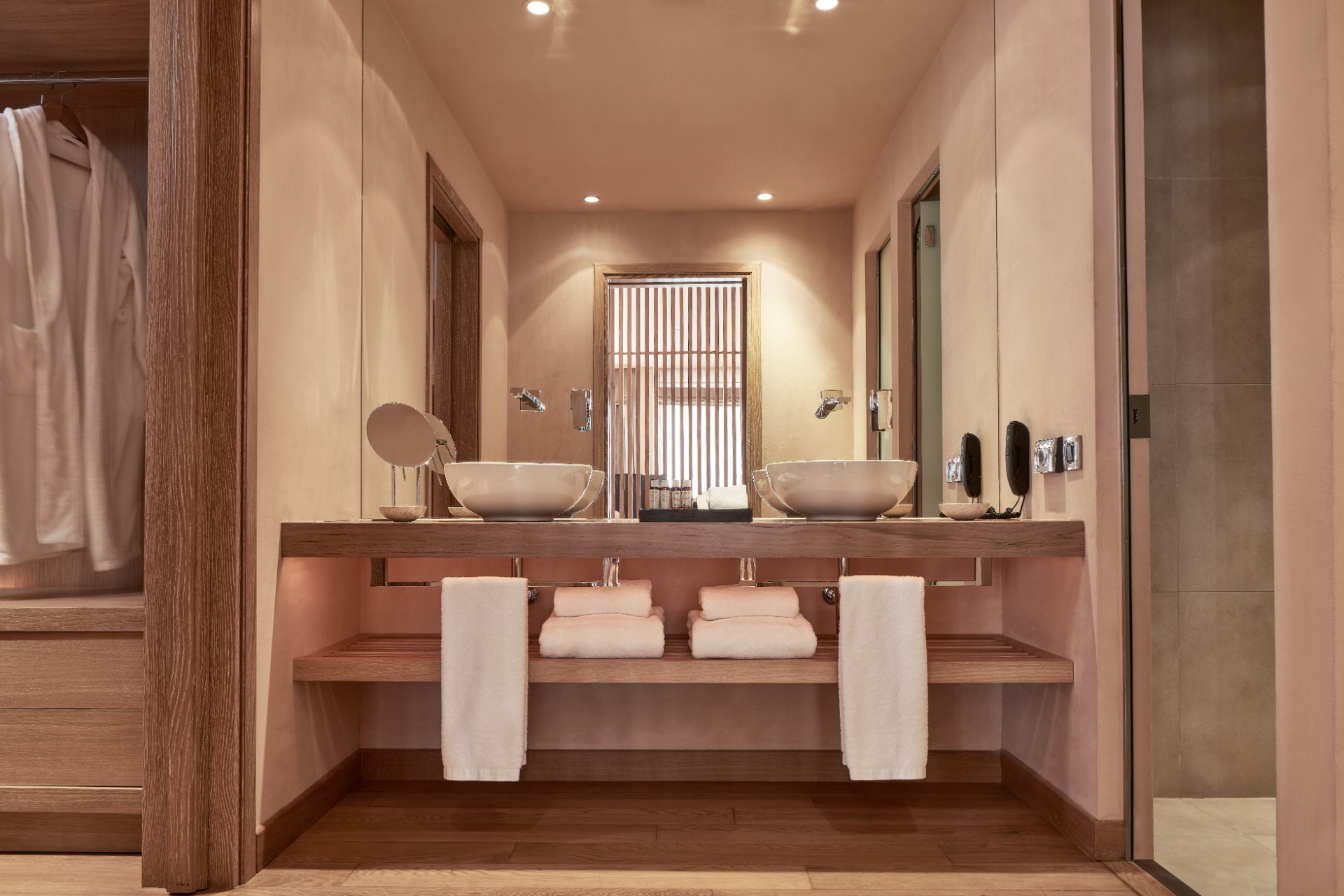 The suite features an oversized king size bed, a Séparé to the bathroom, hand-selected art pieces, a polished wood floor, leather sofas and a classical style office desk. Located right by the forest, it’s the ideal spot for relaxation and rejuvenation.